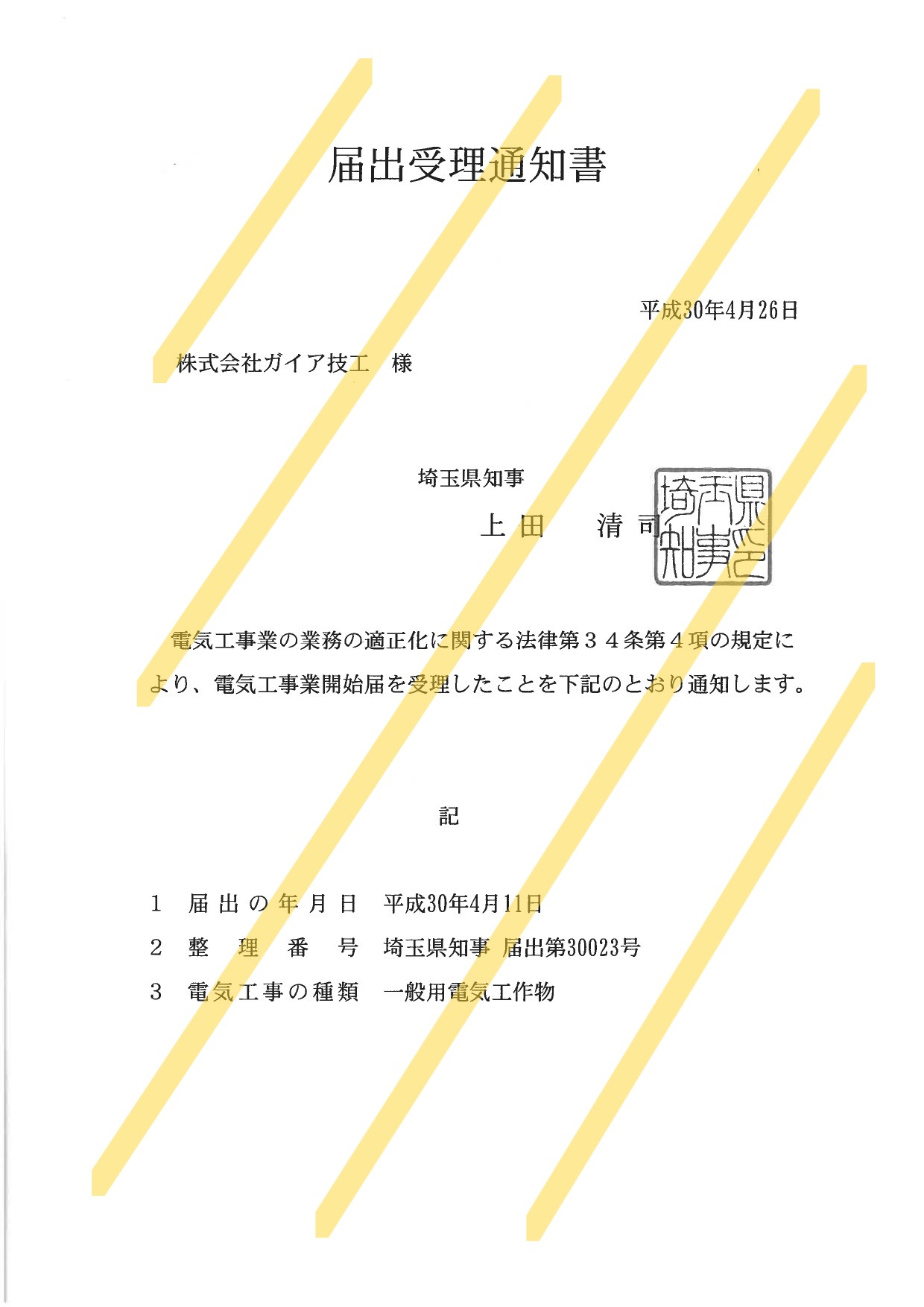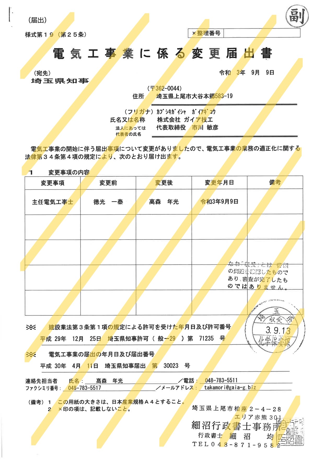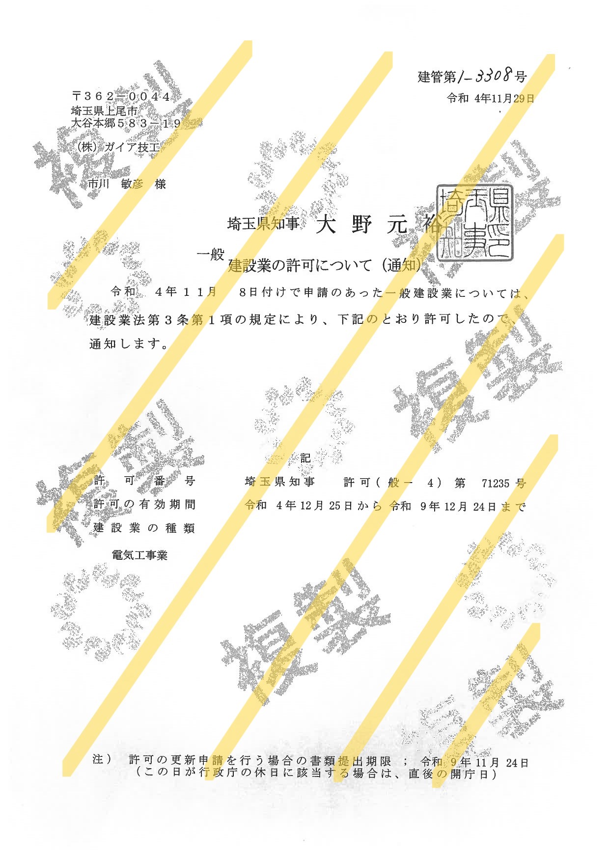 埼玉県知事 許可(般-4)第71235号 電気工事業 ※参考資料